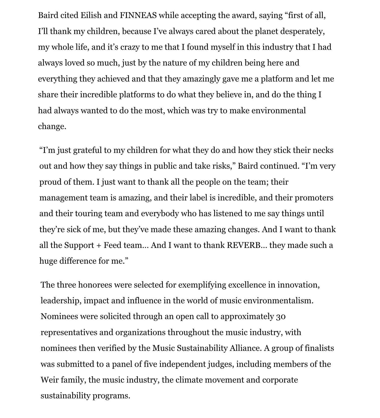 Nominees will be evaluated based on the impact, influence, and innovation of their work, as well as commitment to advancing sustainability across the music industry through education, collaboration and measurable action.