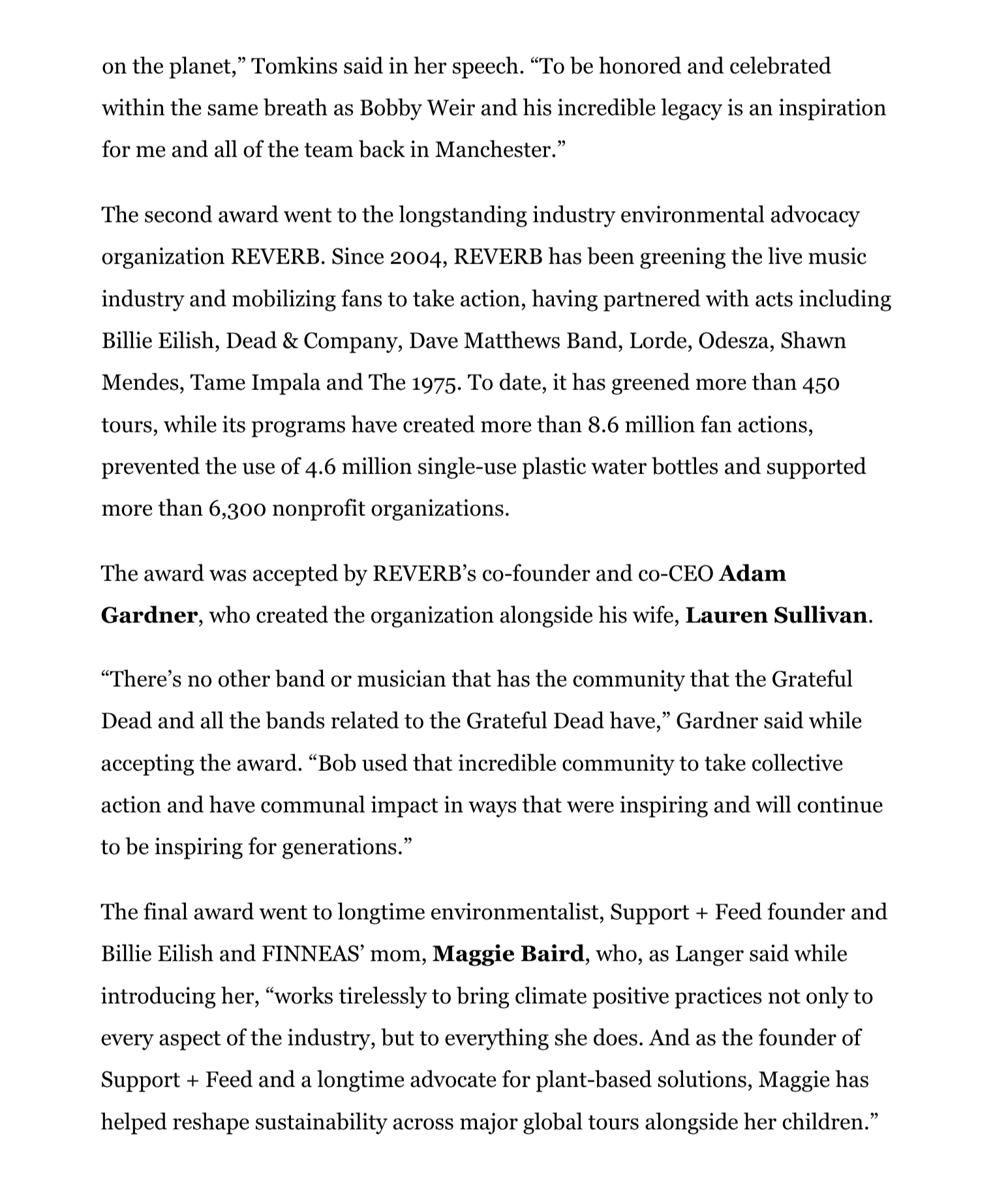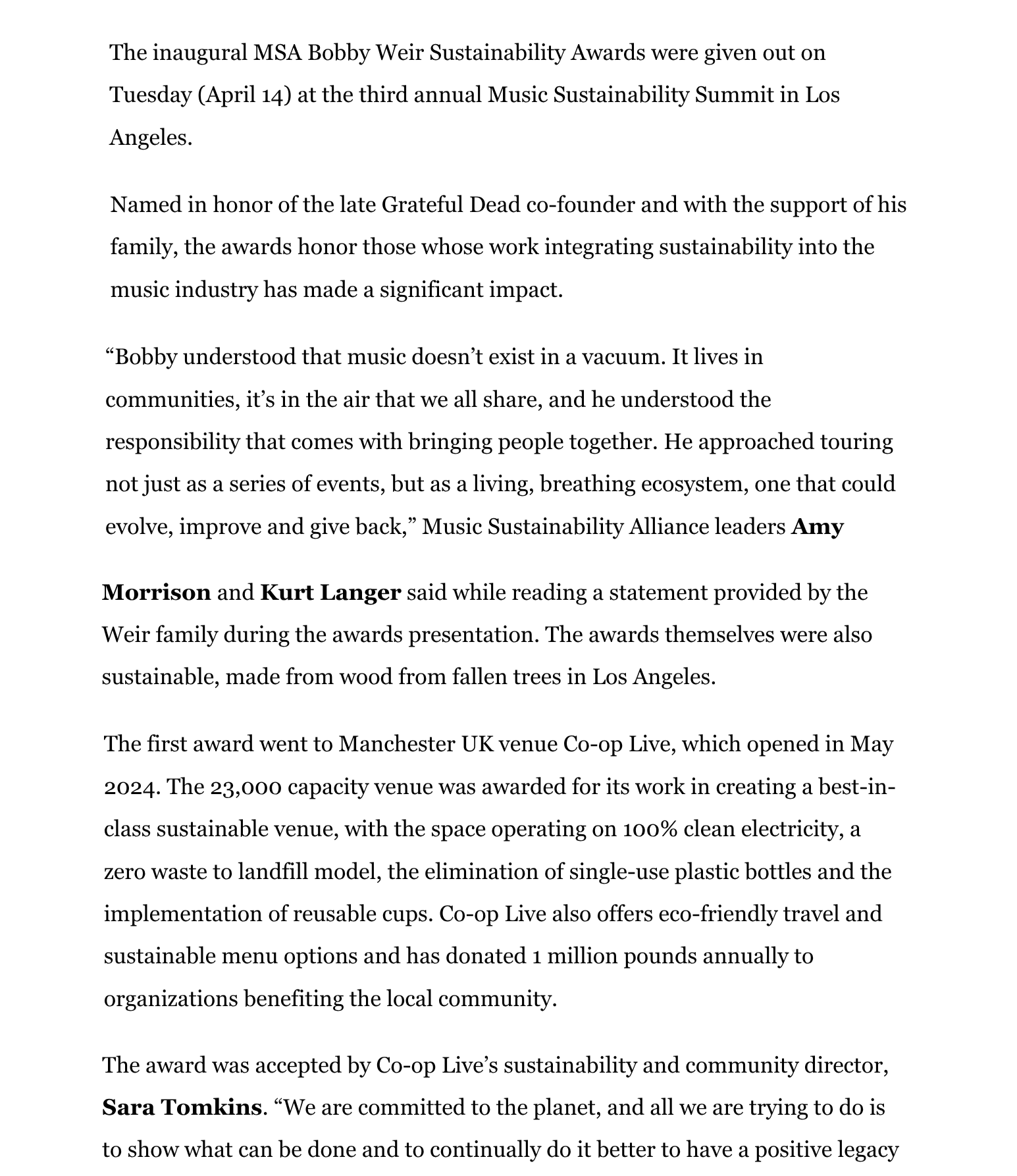 “Bobby Weir has long demonstrated how music can inspire care for the planet, and we’re honored to have the support of the Weir family to recognize the innovators and leaders transforming the music industry and turn that spirit into real environmental progress,” said MSA co-founder and CEO Amy Morrison. “We hope the awards will shine a spotlight on the people across the music ecosystem who are proving that sustainability and creativity can move forward together.”